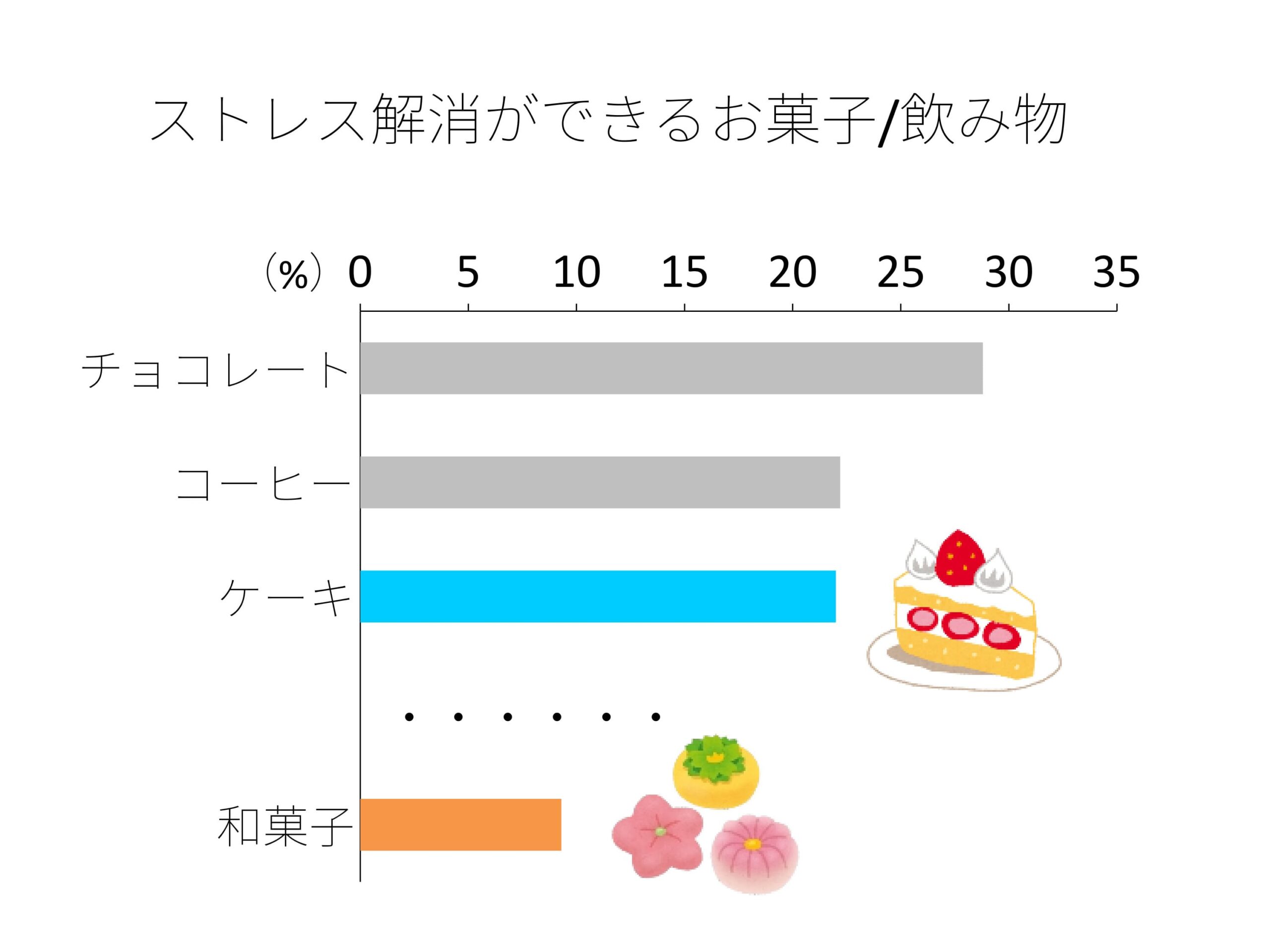 市販のアイスクリームを購入して食べた10~60代の男女合計600人を対象に「ストレス解消ができると思うお菓子/飲み物は何か?」という質問をしています。これによると上位3つはチョコレート(28.8%)、コーヒー・ココア・紅茶(22.2%)、ケーキ・シュークリーム(22.0%)でした。