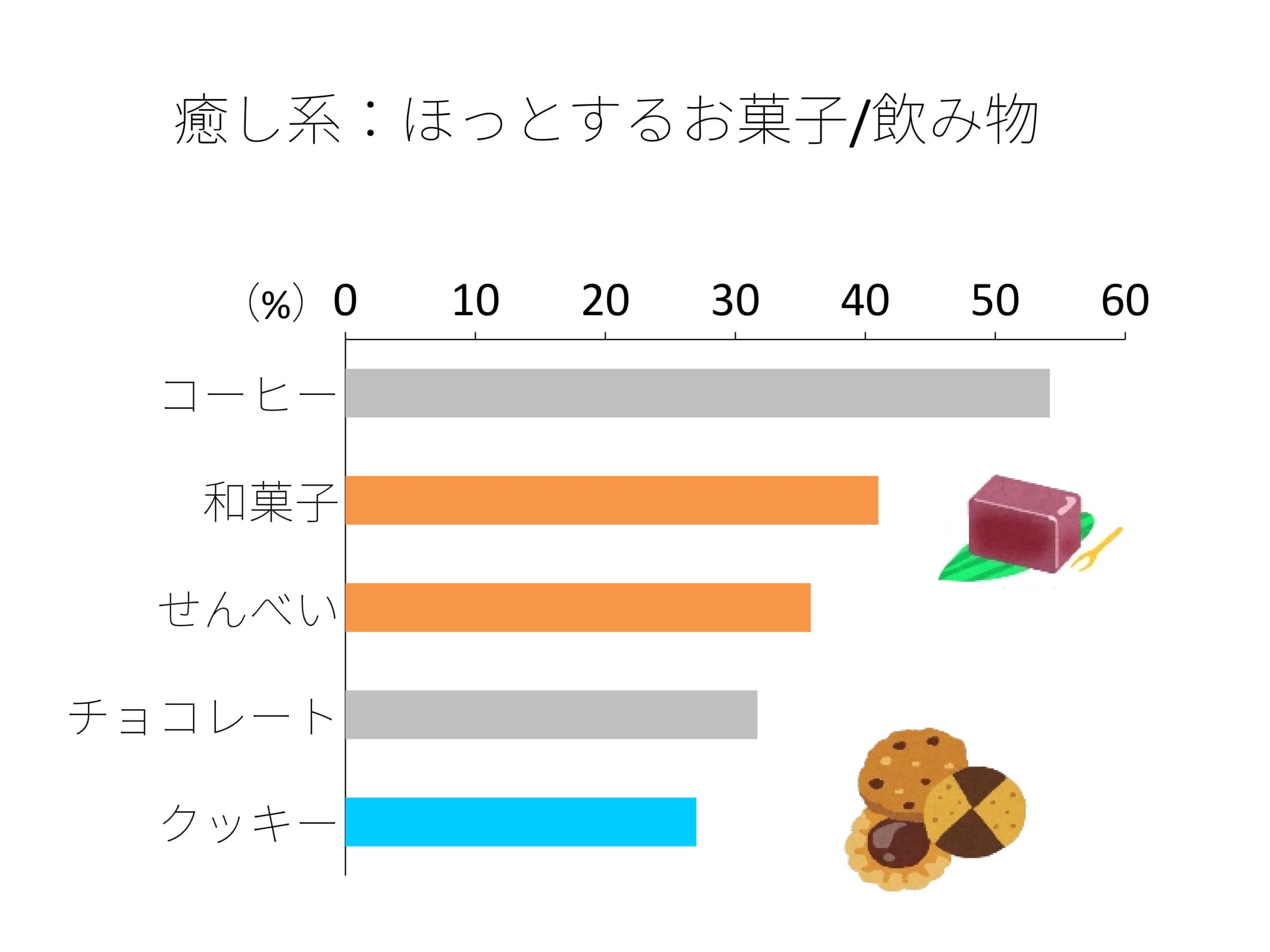 続いて質問には「食べるとほっとする癒し系のお菓子/飲み物は何か?」というものがあります。これには第1位がコーヒー・ココア・紅茶(54.2%)となっており、第2位に和菓子(41.0%)、第3位に米菓:せんべい・あられ(35.8%)が選ばれていました。