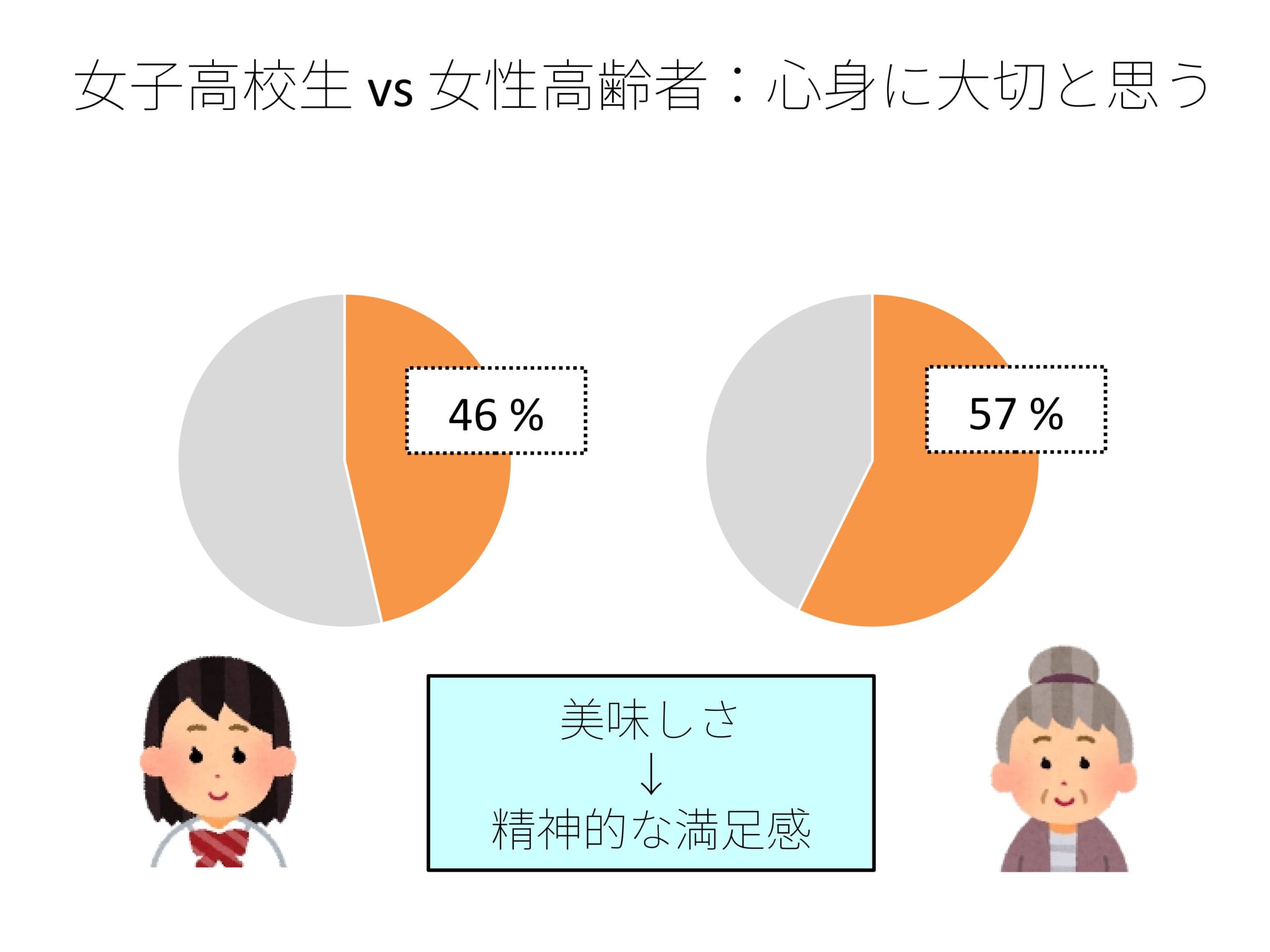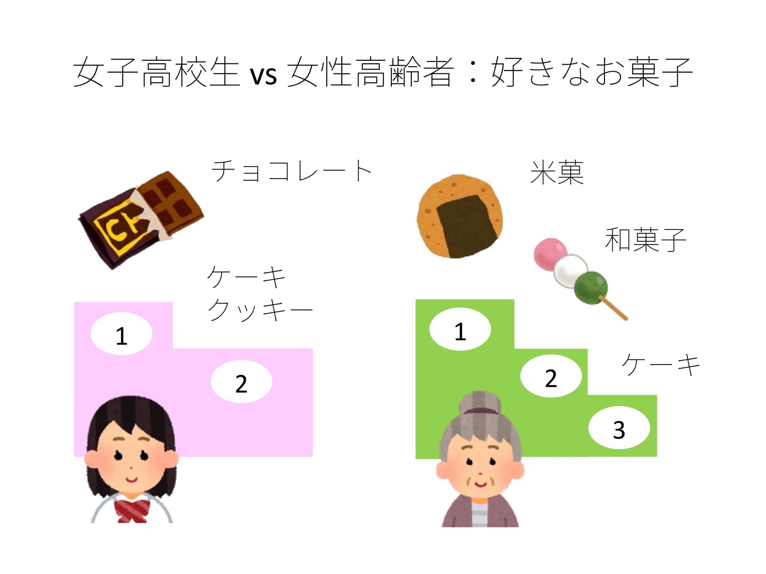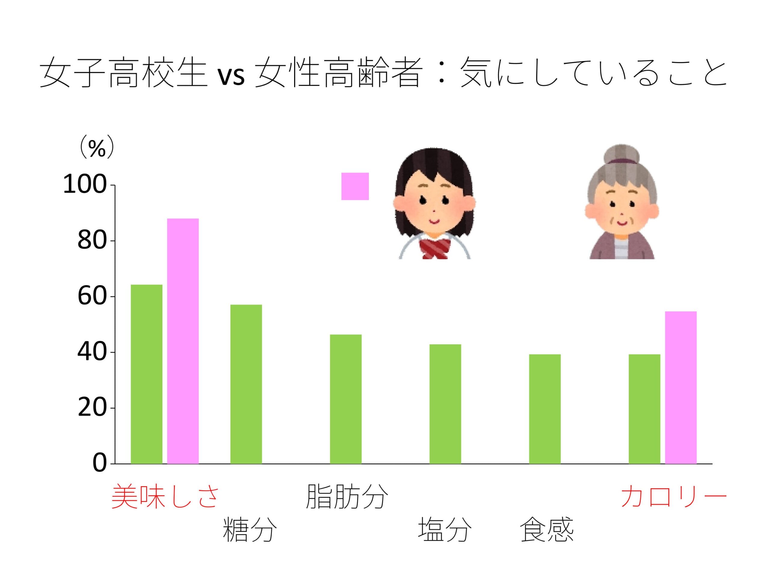 女子高校生(75人)と女性高齢者(平均年齢73.4歳、28人)を対象にしたお菓子に対する意識調査というおもしろい報告があります(大西梨沙ら 名古屋文理大学 2014年)。