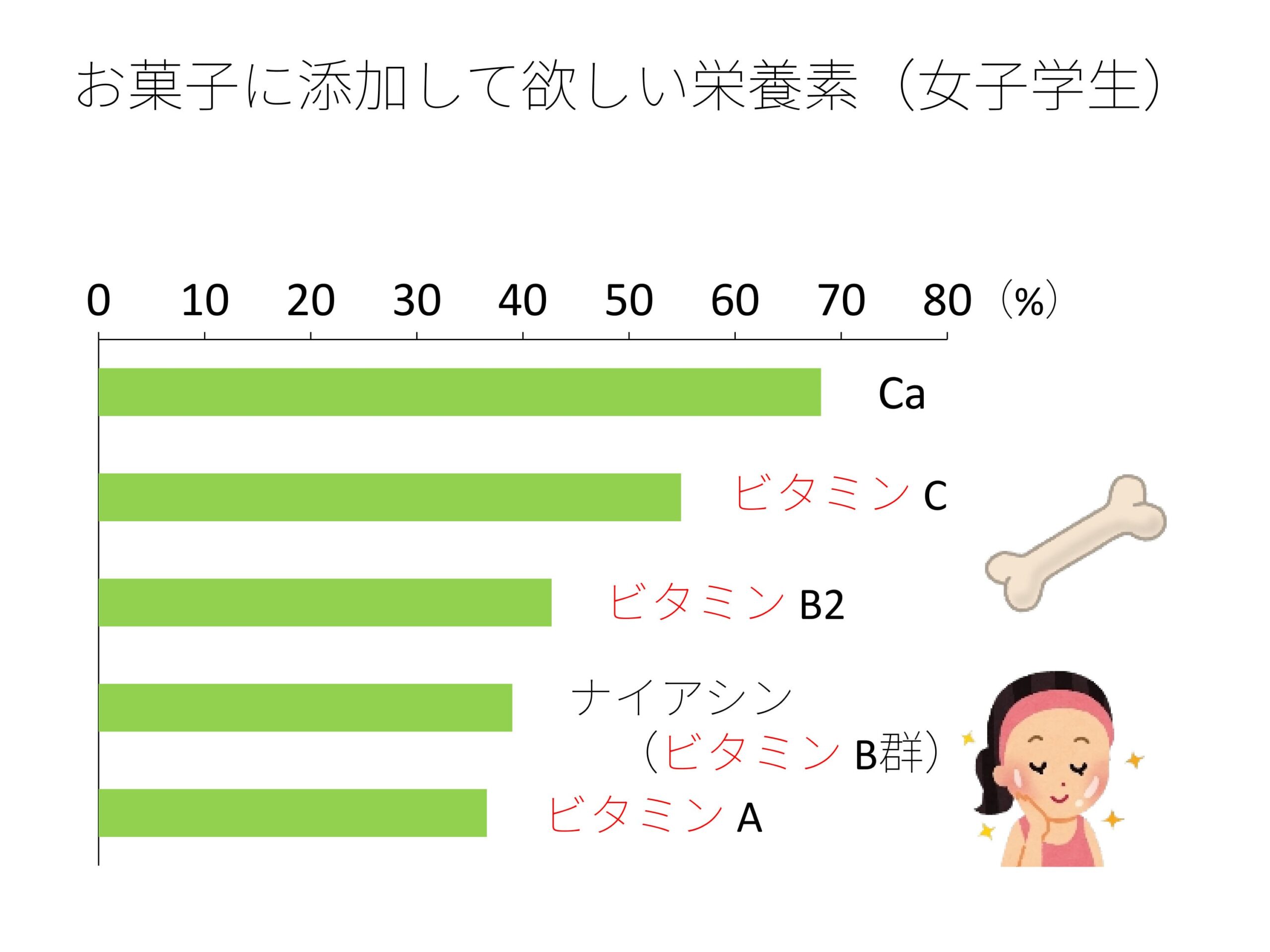 栄養学を学ぶ女子大学生と食物学の体験授業に参加した女子高校生合計213人をモニターとしたお菓子に対する食意識調査報告があります(隅田衣江ら 大妻女子大学 2012年)。この中に「お菓子に添加して欲しいと思う栄養素は?」という質問があります。