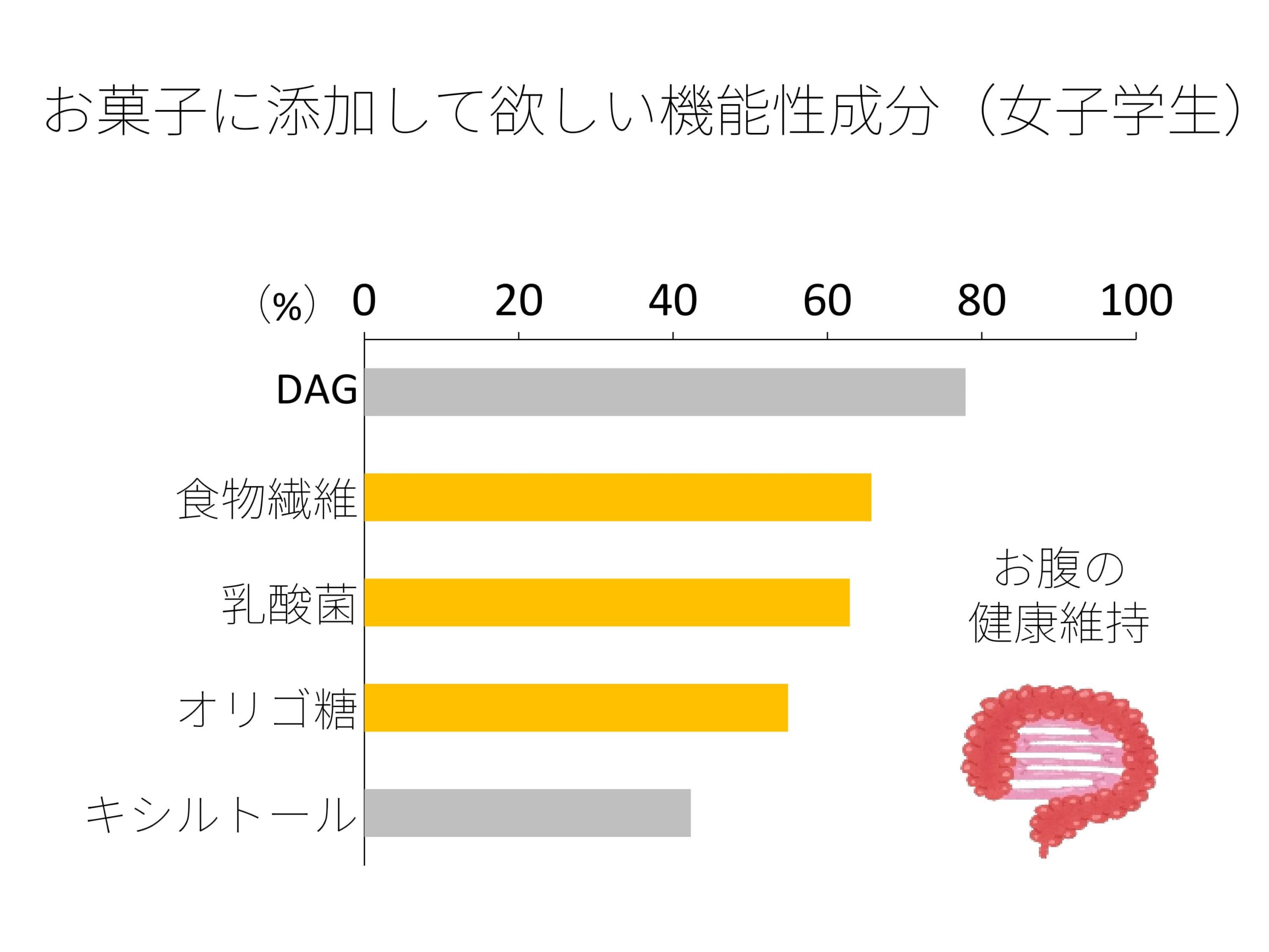 このように女子学生がおやつ/お菓子から毎日補給したいと考える機能性成分は食物繊維・乳酸菌・オリゴ糖といった「お腹の健康維持」というジャンルのものでした。