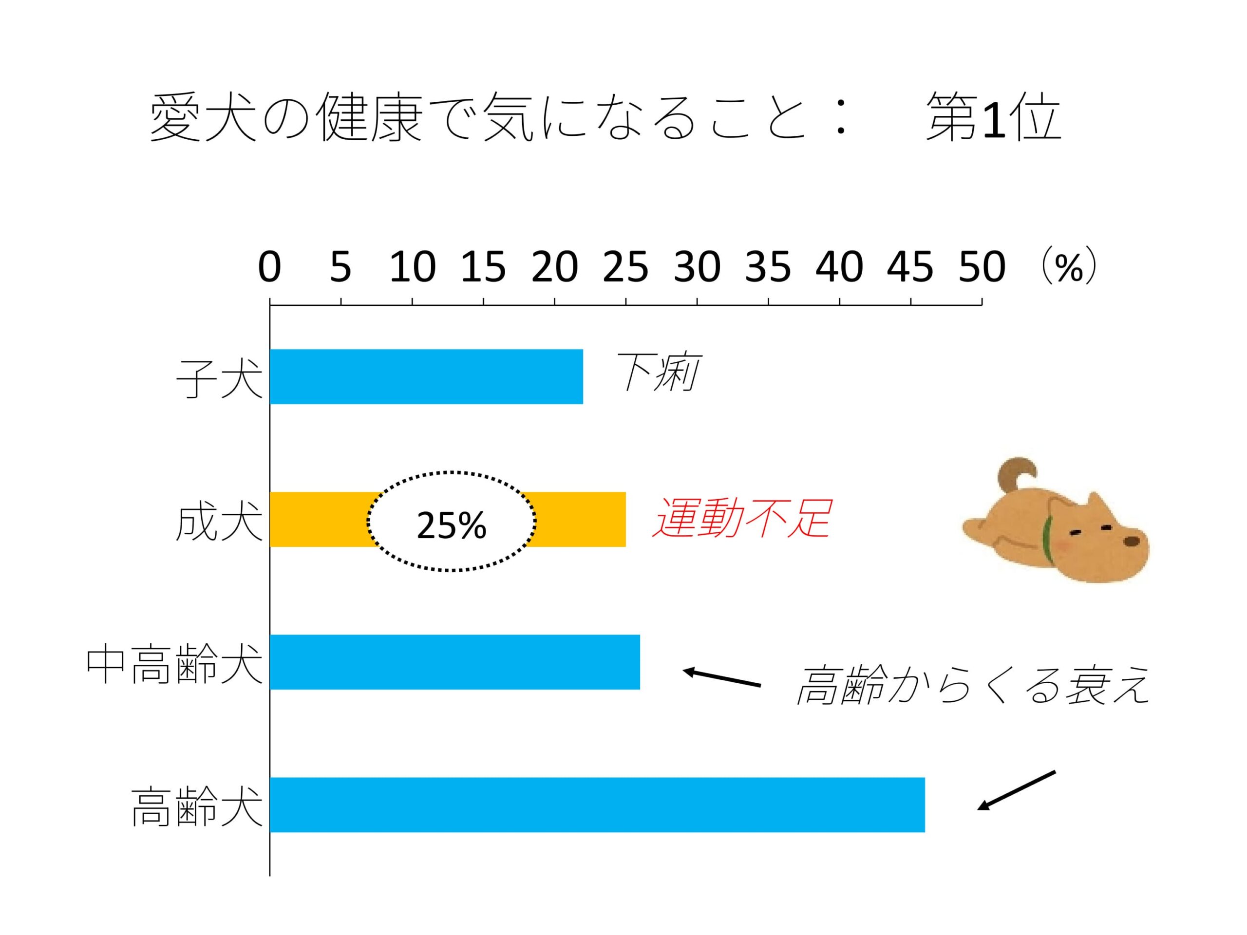 この回答を愛犬の年齢グループごとに集計したところ、子犬群:下痢(22.0%)、成犬群:運動不足(25.0%)、中高齢犬群および高齢犬群は共に高齢からくる衰え(26.0%、46.0%)が第1位という結果でした。なお子犬群では第2位に運動不足(17.0%)が入っていました。