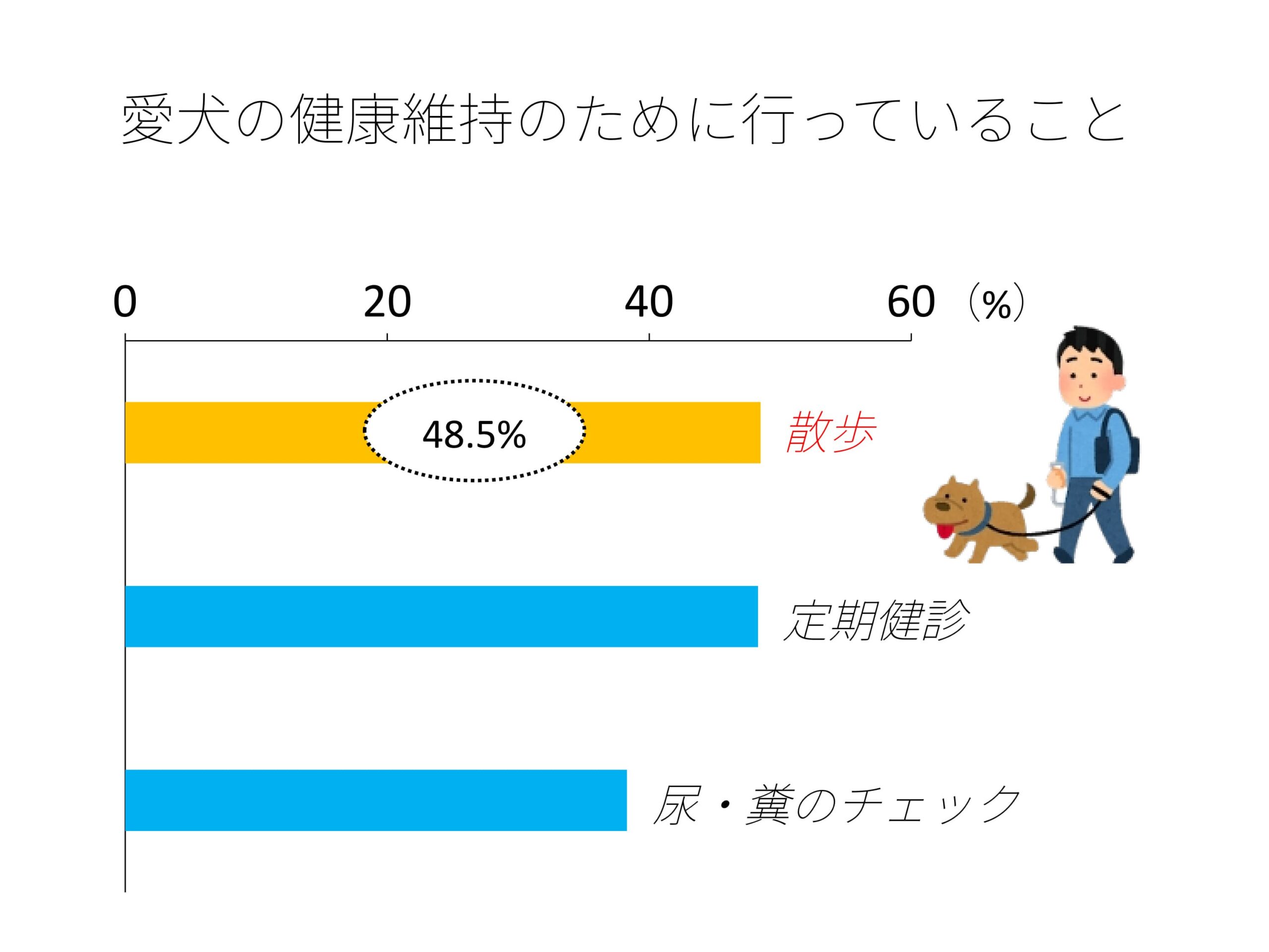 続いての質問に「愛犬の健康維持のためにどのようなことをしていますか?」というものあり、これに対しての総合第1位の回答は散歩(48.5%)でした。この結果を年齢グループでみても子犬群:第1位(散歩50.0%)、第5位(よく遊ばせる29.0%)、高齢犬群でも第2位(散歩46.0%)となっています。