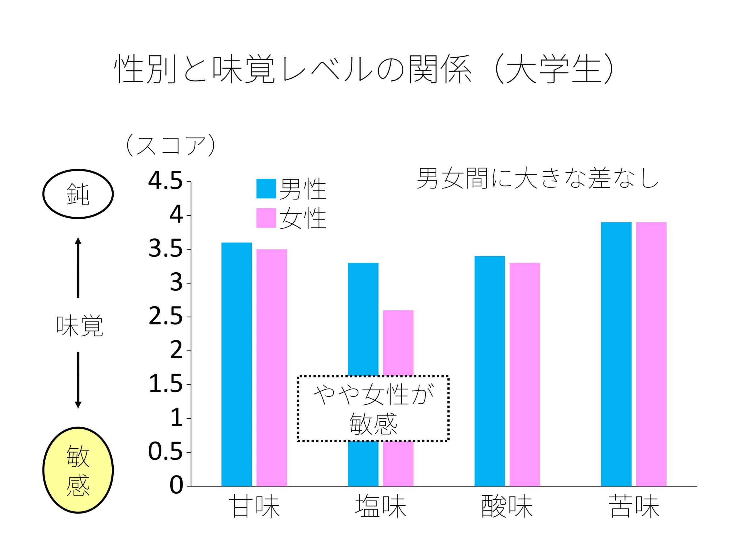 4基本味を認識できた濃度を1(低濃度)~5(高濃度)にスコア化し、男性18人女性25人の平均値を求めたところ、塩味(男性3.3、女性2.6)以外の甘味・酸味・苦味ではほぼ同等でした。数値が小さいほど味覚が鋭いとなりますので、結論として塩味に関しては女性の方がやや敏感であるといえそうです。