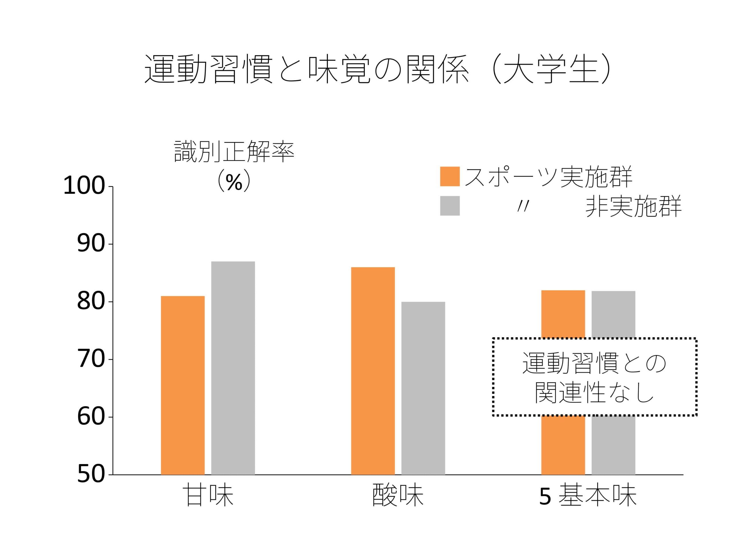 では運動習慣と味覚感受性の関係についてはどうでしょう。仙台大学の佐々木繁盛らは大学生男女35人を日頃から意識的に運動を行っているスポーツ実施群(20人)と行っていない非実施群(15人)の2グループに分けました。そして両群に5基本味の識別試験を行い正解率を比較しました(2011年)。