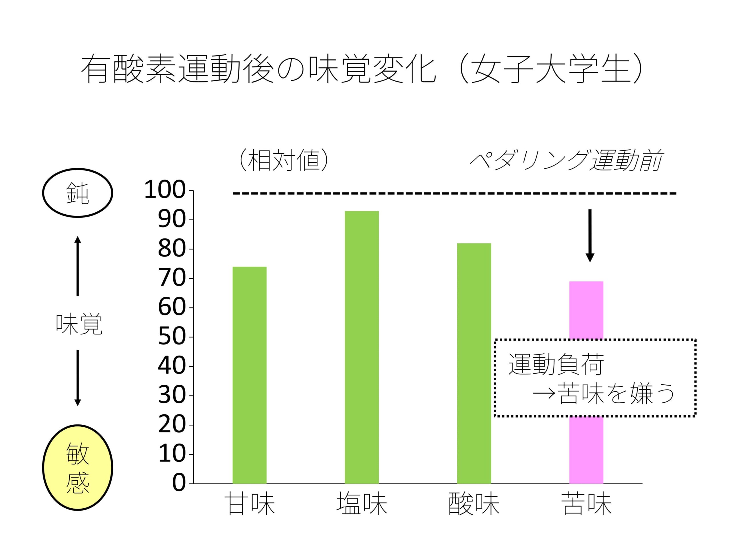 結果では塩味を除いた甘味・酸味・苦味に低下が確認されました。中でも苦味は最も低い値(69)を示しており、これは自転車ペダリングのような有酸素運動後は苦味に対する識別能力の向上=苦味に敏感になっていることを示しています。