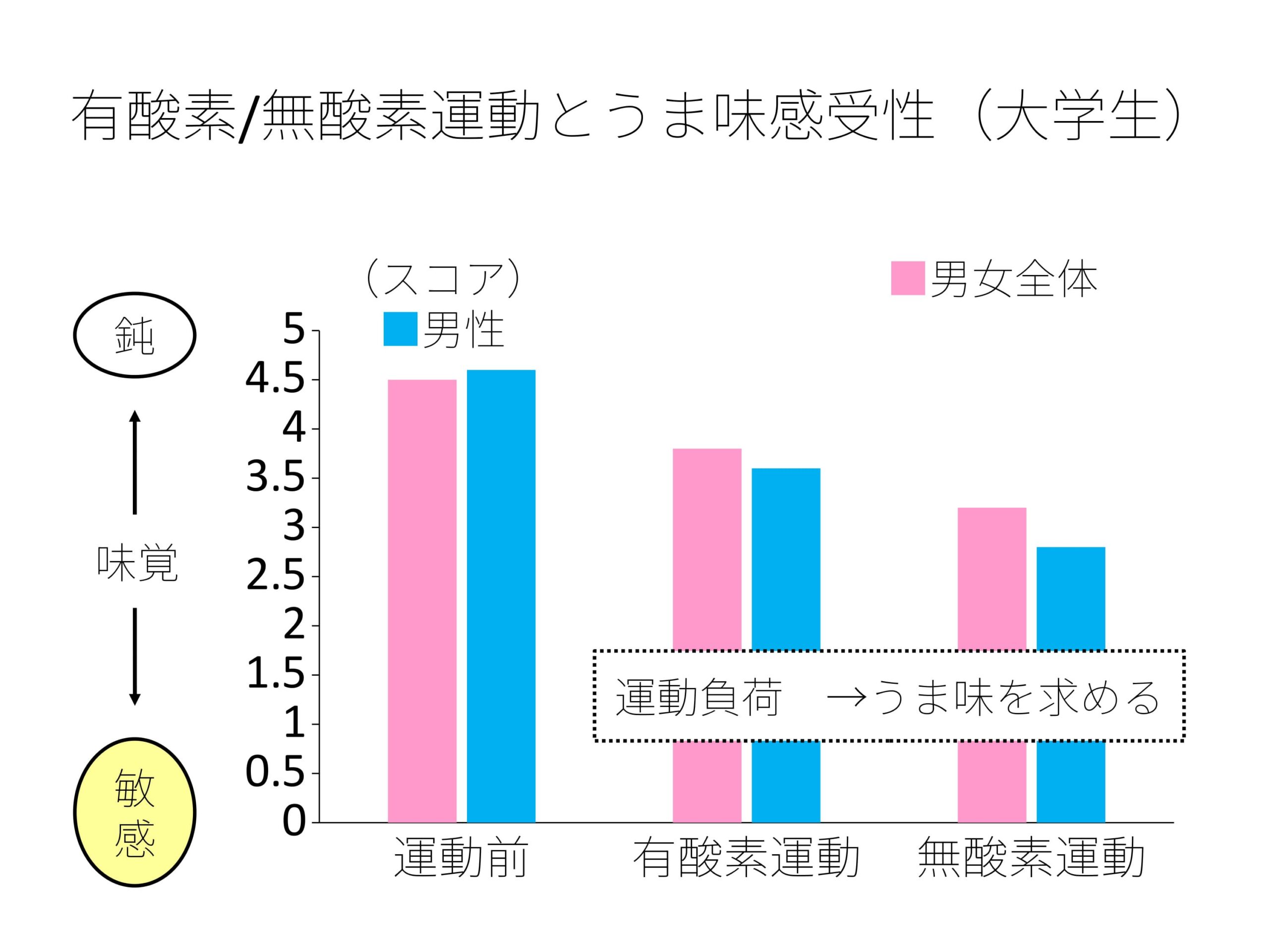 甘味・塩味・酸味・うま味の4基本味を認識できる濃度をスコア化し、運動前後で比較したところ、うま味に関して運動前→有酸素運動後→無酸素運動後の順で数値の低下が見られました。これを男性モニター5人に限定すると運動前(4.6)→有酸素運動後(3.6)→無酸素運動後(2.8)とさらに低下率が大きくなっていました。
