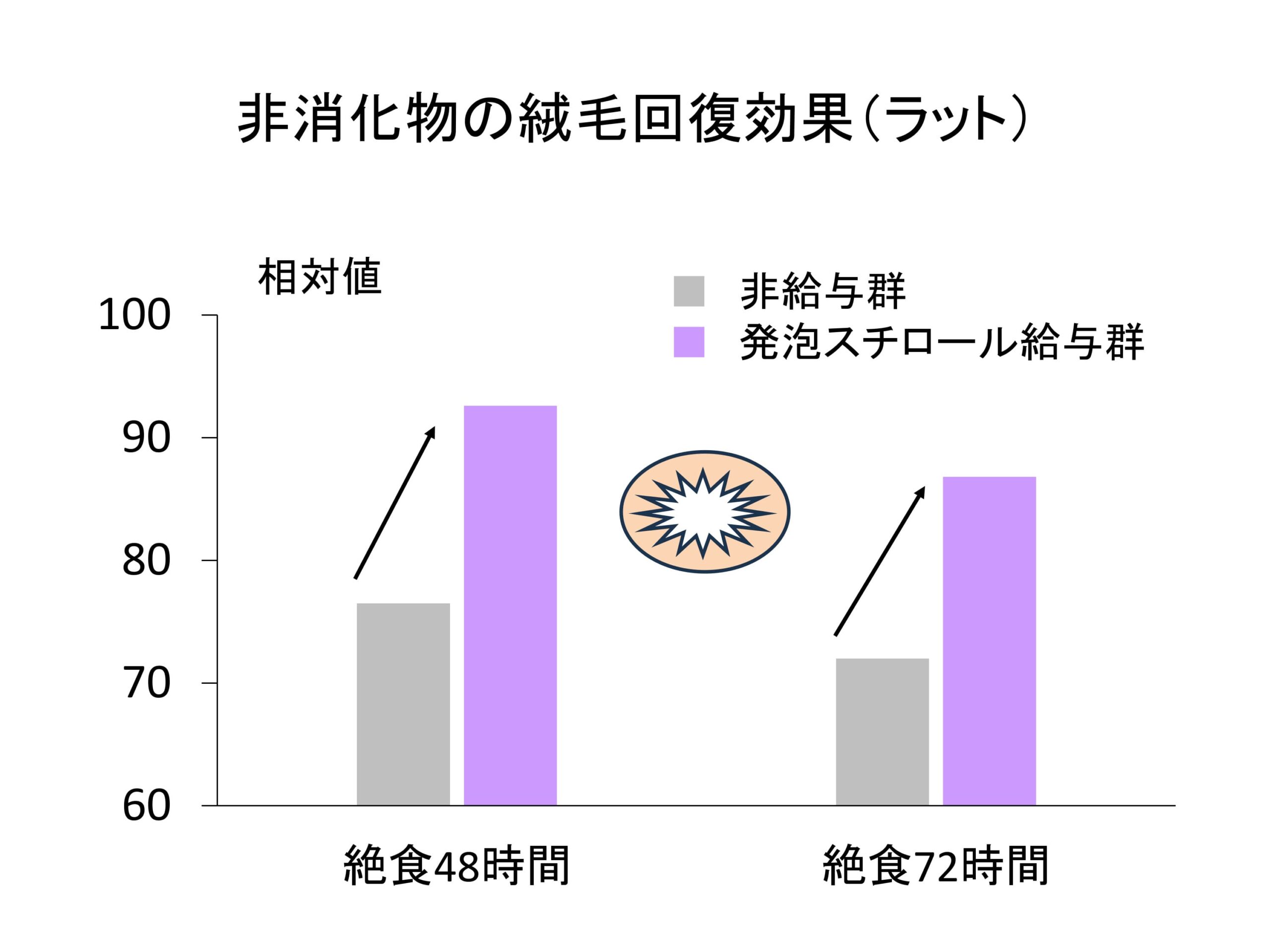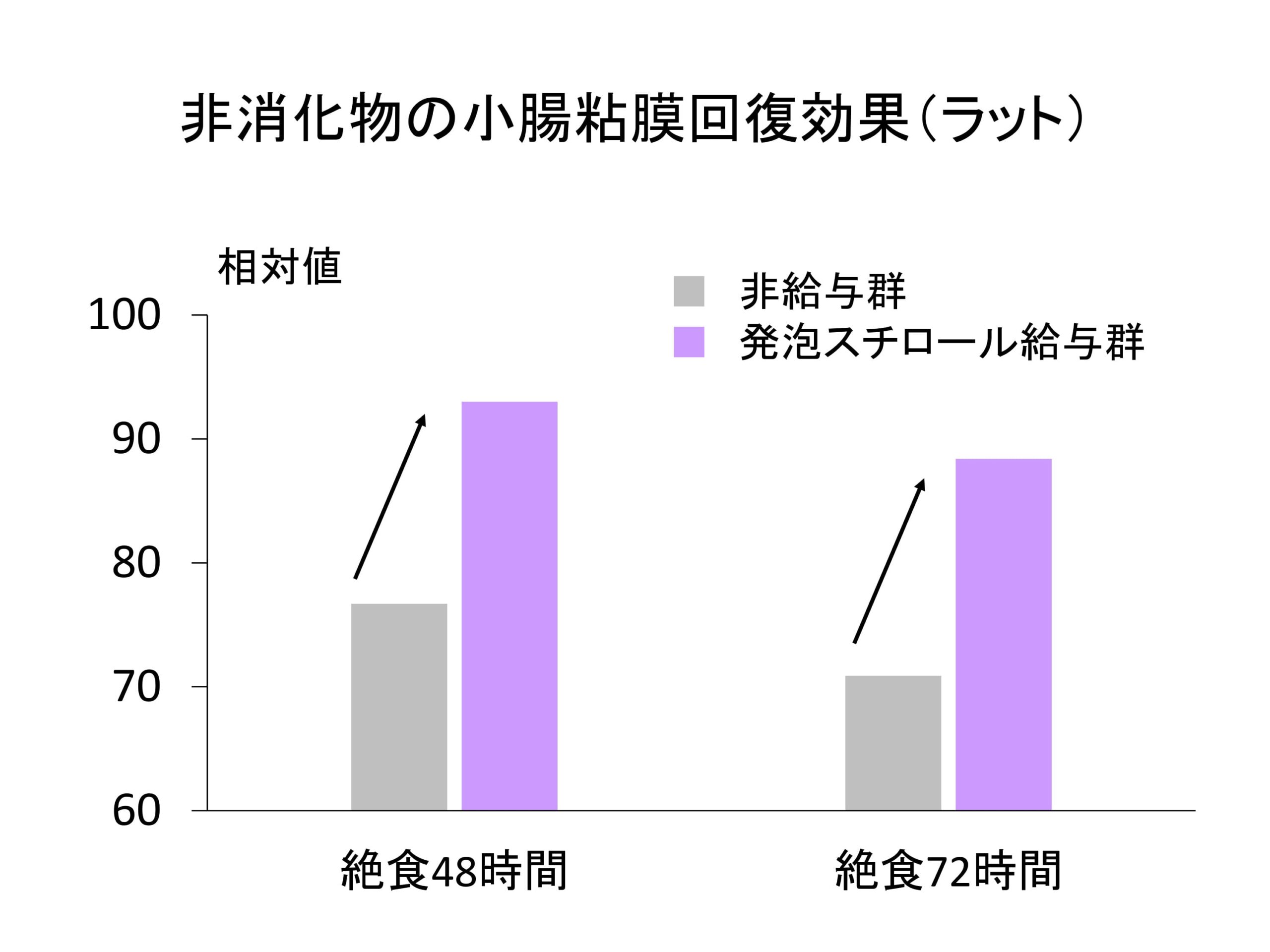 発泡スチロールは消化を受けない物質ですが、体内を通過する時に腸管内面を物理的に刺激します。この刺激が粘膜の増加/絨毛の成長促進といった絶食ダメージからの小腸の回復を応援すると考えられます。意外にも非消化物もまた役に立っているということです。