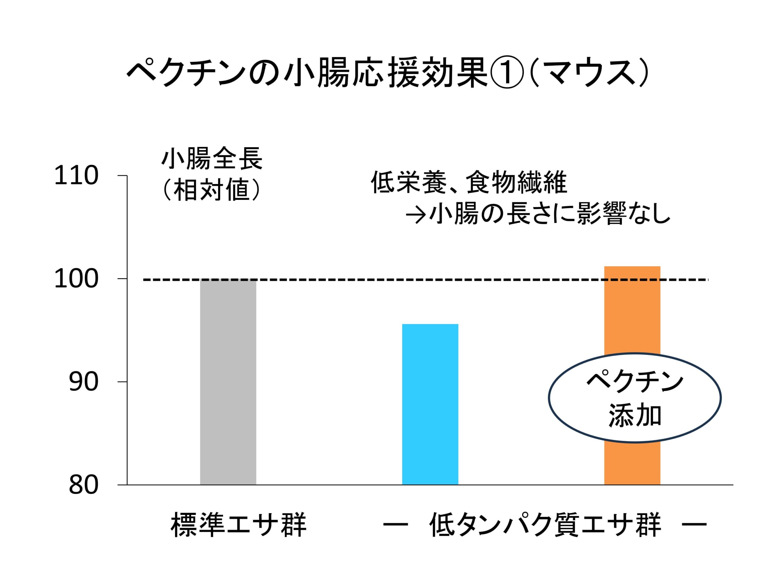 標準エサ群の値を100とする相対値で比べたところ、低タンパク質エサ群が約95、ペクチン添加群は約101と有意な差は見られませんでした。9日間という短い給与期間ではカゼイン量が標準の1/10という低タンパク質のエサでも小腸が短くなることはなく、また食物繊維ペクチンを給与しても長くなるというわけではありませんでした。