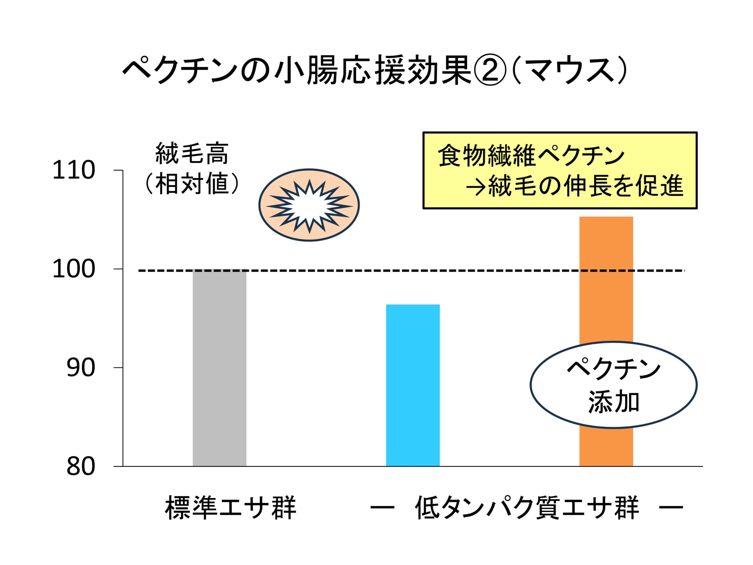 では小腸内面にある絨毛の高さを比べてみましょう。同様に標準エサ群の値を100とすると低タンパク質エサ群は約95と短縮、ペクチン添加群は約101で標準エサ群と同等の値を維持(=絨毛の伸長に貢献)していました。