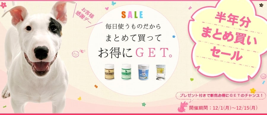 半年分まとめ買いセール!!のページです。期間限定犬用サプリメント半年分まとめ買いセールのご案内。
