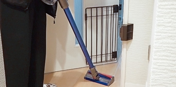 玄関が開いた時にフェンスがでてくるので、開いた瞬間に隙間から飛び出していく事が防げます。また、廊下につけるフェンスとは違い、愛犬が来客者の目の前まで来られるため、まるでお出迎えしているように見えます。