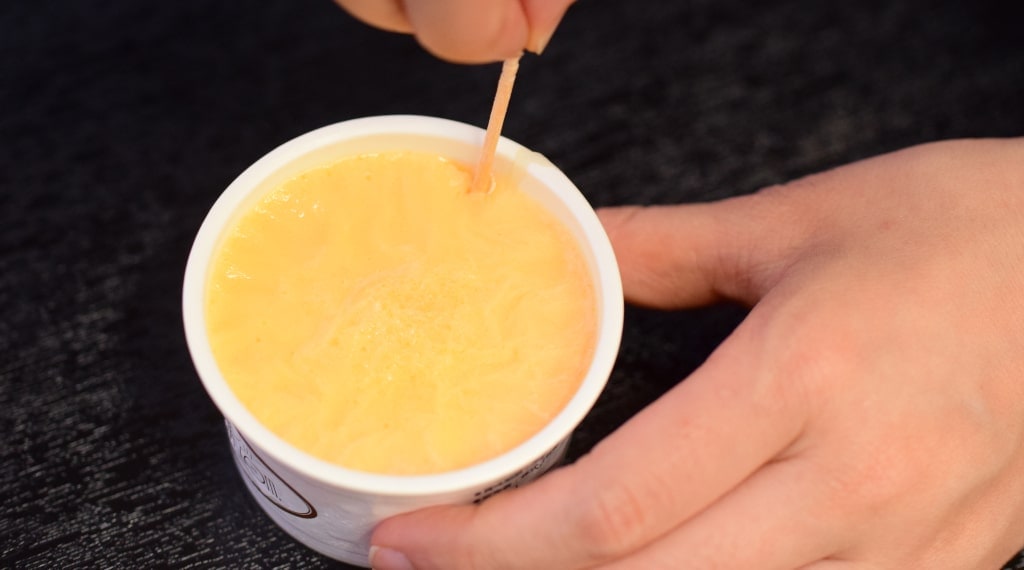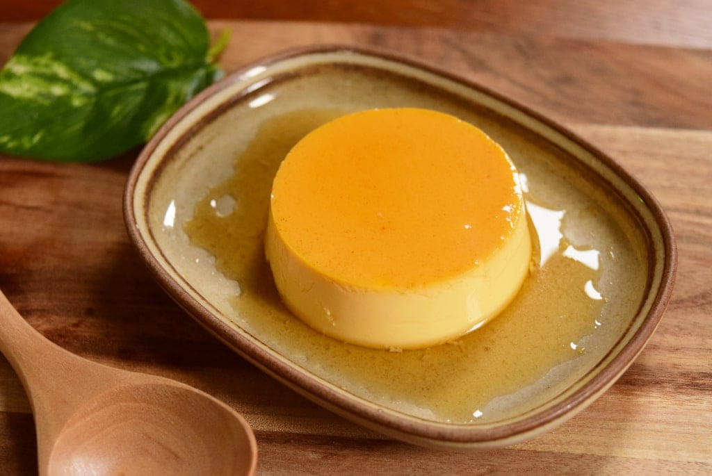 カップからお皿に移すときは、解凍後、プリンのふちの部分を爪楊枝でゆっくりと剥がしてあげましょう。その後、お皿をかぶせて逆さまにすると簡単に出てきます。(出てこない場合は軽くカップをゆするなどしてください)