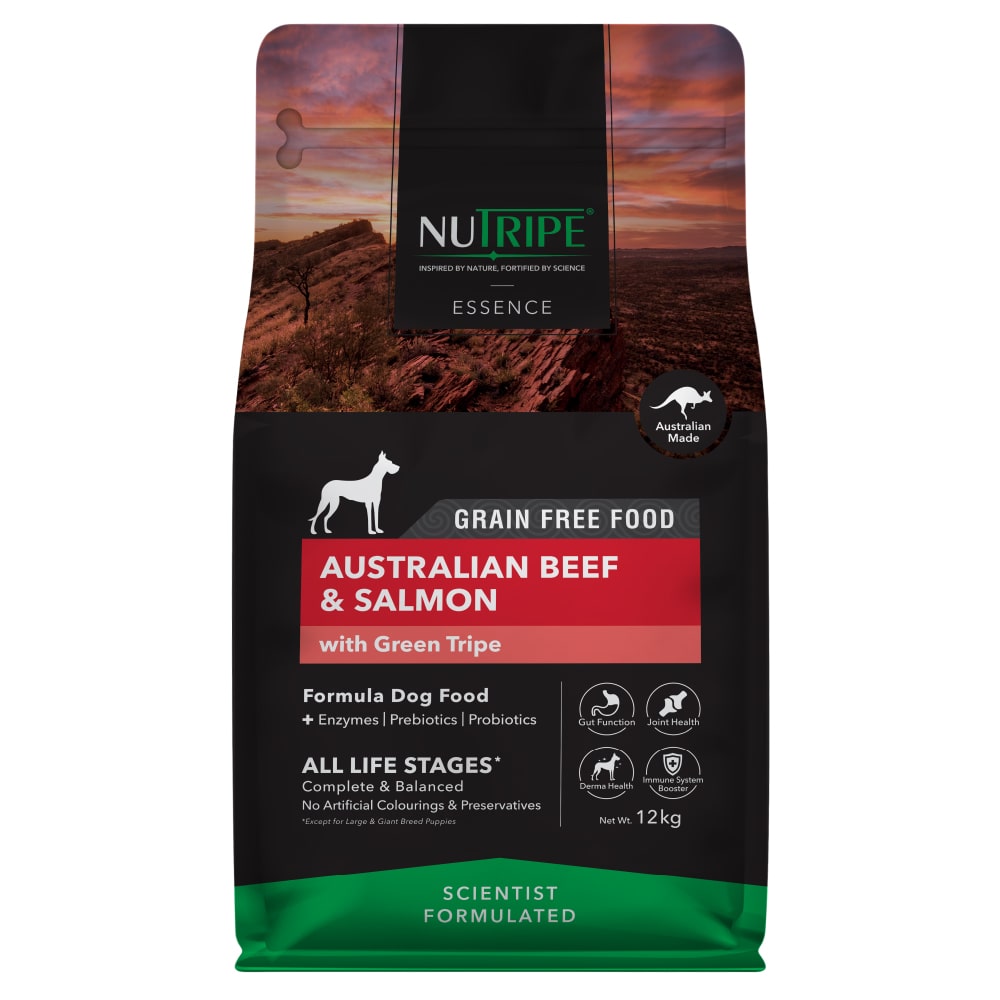 オーストラリア産ビーフ、サーモン、グリーントライプ、サツマイモ、エンド ウ豆、鶏脂、ナチュラルフレーバー、カボチャ、ほうれん草、 ブロッコリー、リンゴ、クランベリー、ウコン、緑イ貝、 塩化カリウム、ビタミン・ミネラル類(ビタミンA、D、E、K、B1、B2、B3、B5、 B6、B12、葉酸、ビオチン、クエン酸、硫酸亜鉛、硫酸鉄、キレート亜鉛、 キレート鉄、硫酸銅、酸化マンガン、キレート銅、キレートマンガン、 ヨウ素、セレン)、塩化コリン、プレバイオティクス(フラクトオリゴ糖(FOS) 、マンナンオリゴ糖(MOS))、タウリン、ケルプ、ユッカシジゲラエキス、 L-リジン、酵素(アミラーゼ、プロテアーゼ)、プロバイオティクス ( 枯草菌)、DL-メチオニン、ミックストコフェロール、ローズマリー エキス