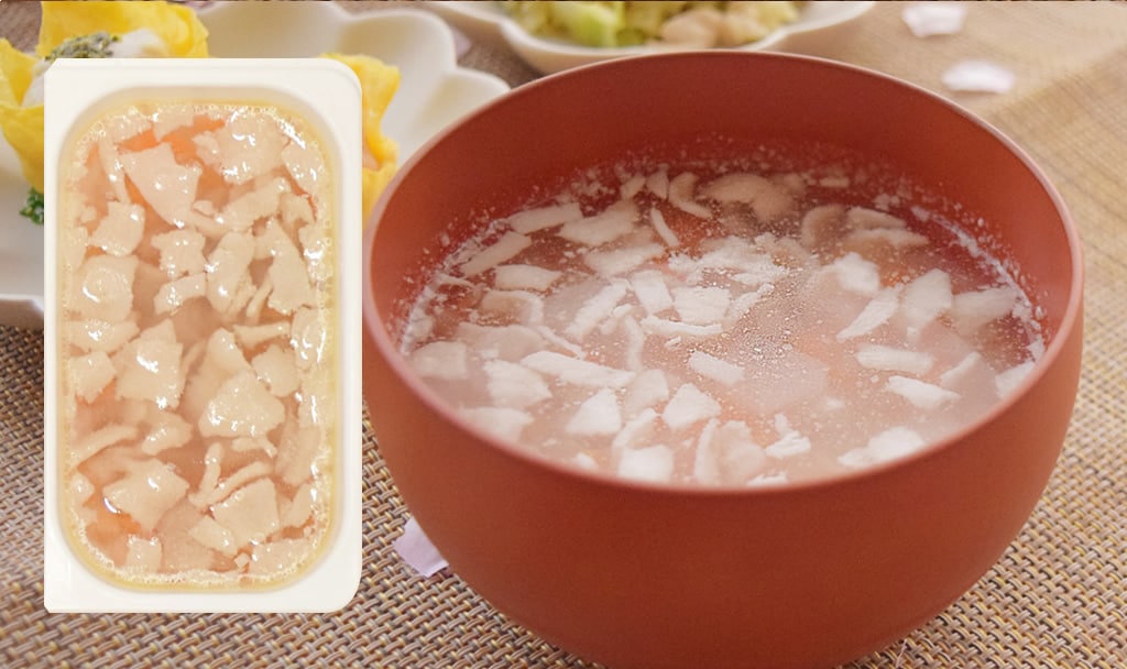 成分分析値(100gあたり):たんぱく質3.6%、脂質5.9%、炭水化物5.7%、水分84.9%、ナトリウム0.01%、カリウム0.11%、リン0.029%、カロリー:102kcal/1トレーあたり