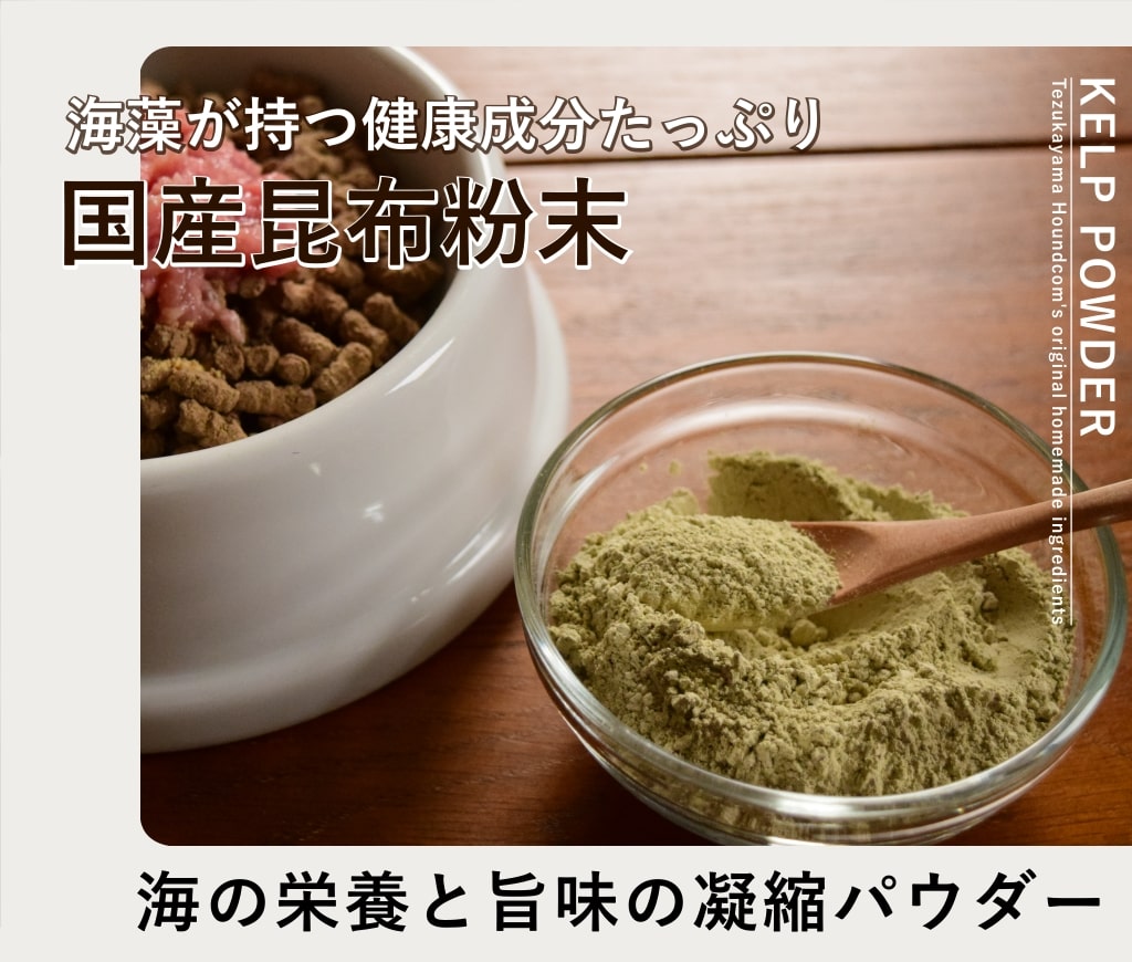 【国産天然 昆布粉末】は低カロリーでミネラルが豊富!昆布は水やお湯にはほとんど溶け出さないので、昆布丸ごとを食べやすいよう、粉末にしました。ドライフードのトッピングやおやつ、手作り食のサポートに最適です。 【国産天然 昆布粉末】をいつもお使いのお客様はこちらのページからご購入下さい。