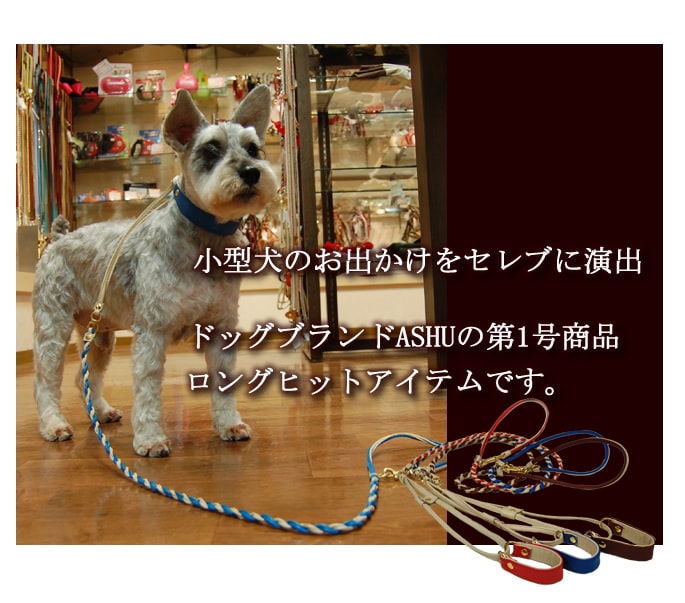 ASHUツイストコンビカラーチョークリード Mサイズは小型犬にお勧めの首輪です。ASHUツイストコンビカラーチョークリードはドッグブランドASHUの第1号商品 ロングヒットアイテムです。